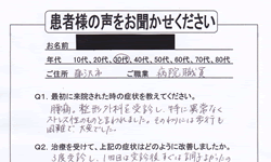 3度施術を受けて、1回目は施術後すぐは調子良かったのですが、また痛みがあり2回目も受けました。3回目で改善されました。